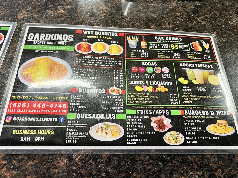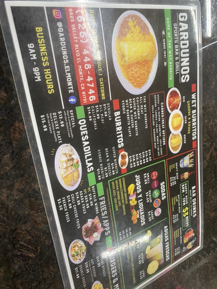 Introducing the menu at Garduno's Sports Bar & Grill, a Latinx-owned Mexican sports bar in El Monte, CA. This casual spot offers a variety of vegetarian options and happy hour specials, making it a great choice for lunch or dinner. Customers rave about the flavorful dishes, like the popular Menudo soup and mouth-watering Wet Burrito. The red salsa is a standout, bringing out the bold flavors of the food. The cozy atmosphere and friendly staff enhance the dining experience, with quick service and fresh chips and salsa served promptly. Whether you're craving classic tacos or exploring new dishes like Huevos Rancheros, Garduno's is a hidden gem waiting to be discovered. Don't miss out on this authentic Mexican culinary experience.